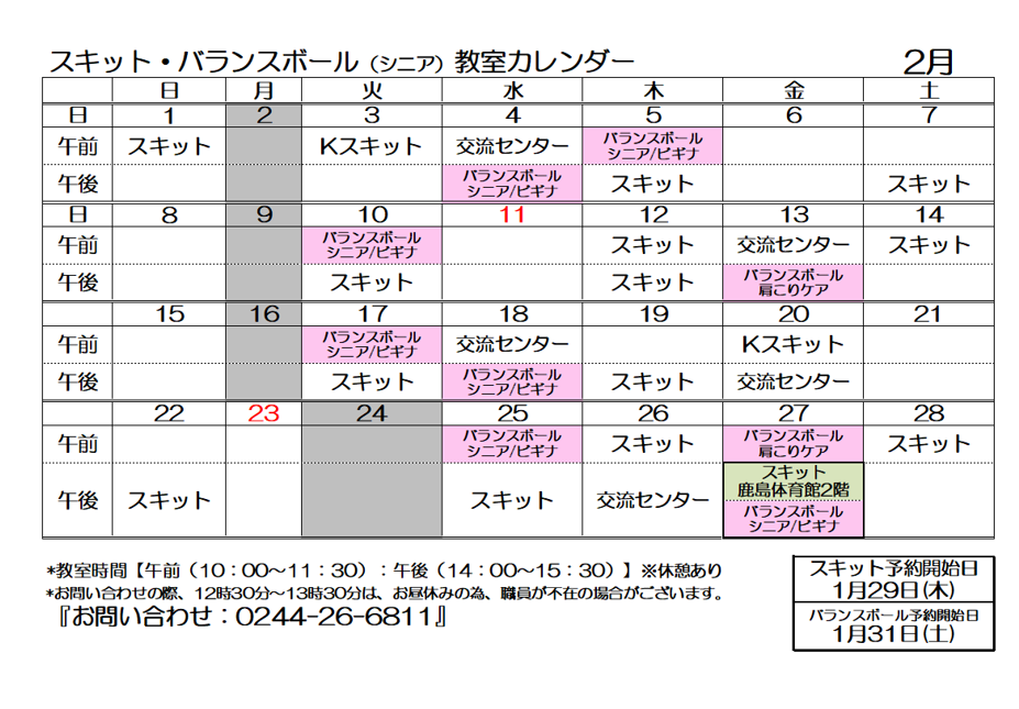 2月教室のご案内・カレンダー